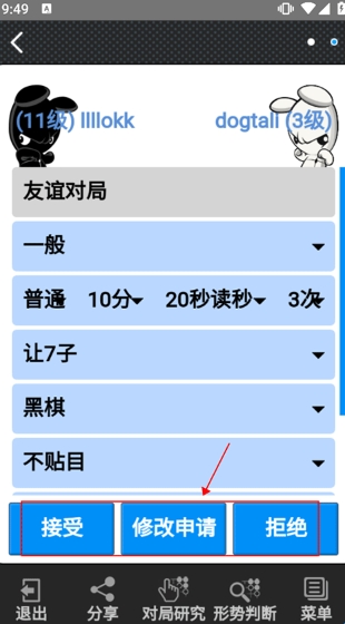 然后就轮到玩家选择,若同意点击接受即可,若不同意则点击拒绝或修改申请