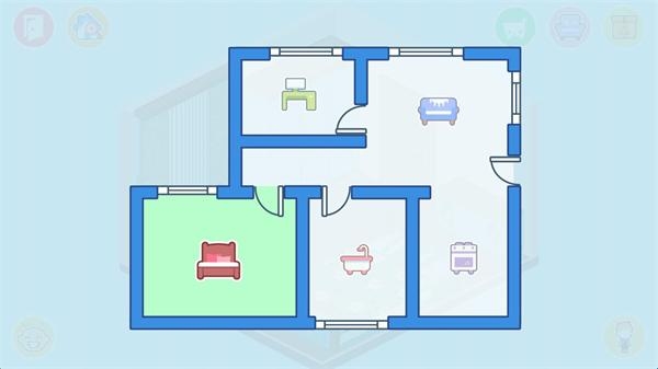 4、点击左上方的房屋按钮可以打开房间平面图,你可以切换不同的房间进行装修。