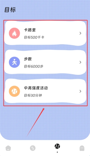 4、目标设定模块支持用户根据个人需求自定义每日卡路里消耗、步数目标及中高强度运动时长等多项指标。