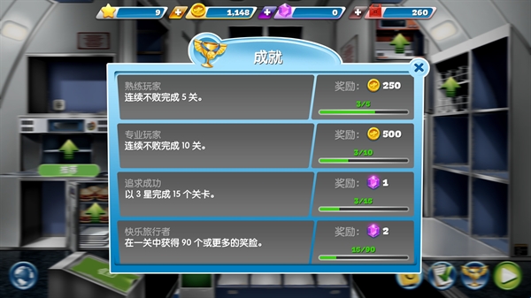 5、游戏采用了关卡的形式,当我们完成一个关卡后就会获得不同的奖励,这些金币奖励可以用于升级机舱内的各种设施,设备的升级不仅可以提高收入,还可以缩短等待制作的时间