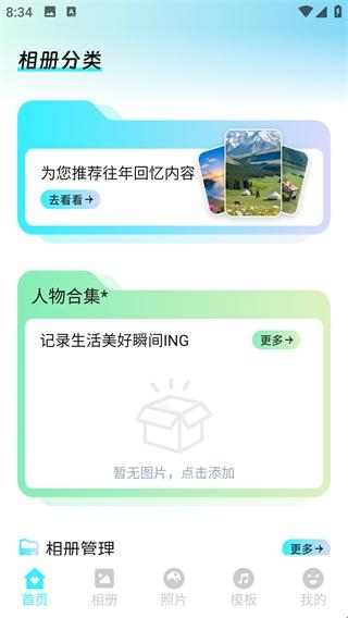 1、进入首页,提供了人物合集、相册管理等服务,同时知晓相册分类。