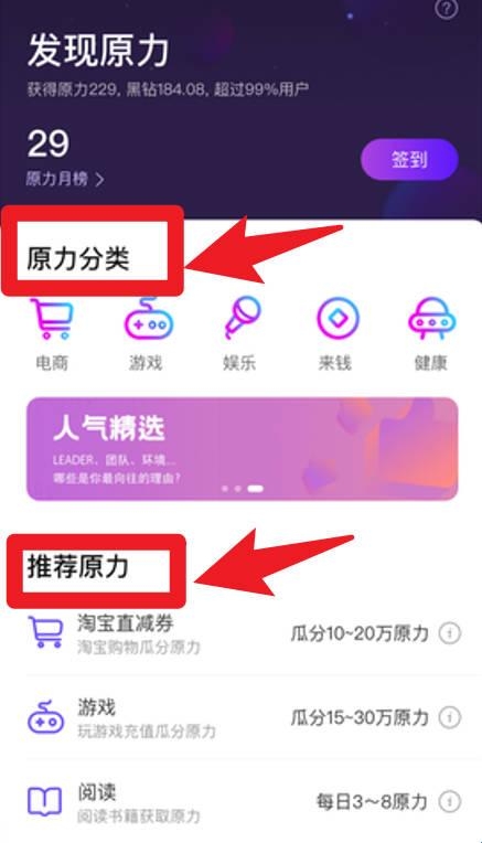 2、在发现原力页面,用户能够根据电商、游戏、娱乐、亲链等分类选择任务,完成后获得对应的原力点数。