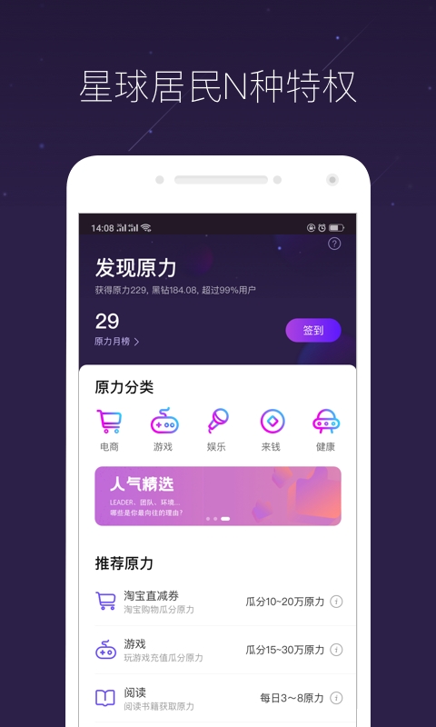 3、涨原力原力决定黑钻的产出速度,拥有的原力值越高,获得黑钻越多,在星球上进行购物、游戏、阅读等活动,可以增加原力值。