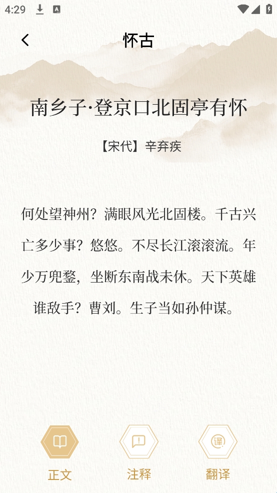 4、古诗词学习助力:便捷获取古诗词文化知识,帮助用户在阅读中提升传统文化知识储备,深化对古典文学的理解。