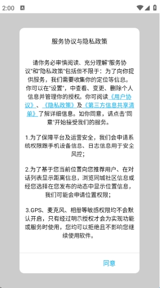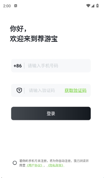 打开荐游宝APP后,阅读服务协议与隐私政策,点击“同意”进入APP;