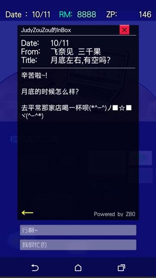 5、右上角的Message就是邮件的意思。邮件记得要及时回信,回信时邮件内容下面会出来可供选择的选项,点第一次是选定,点第二次才是发送。发送后不要急着站起来,退回到电脑的界面之后还可能立刻就收到回信。一个月的中旬会收到来自三千果的邮件,一定要回信,不然可能会错过现实世界的剧情。