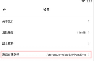 在这里便可看到版本更新以及游戏的存储路径,此前玩家下载的所有游戏都将被保存到:/storage/emulated/0/PonyEmu中