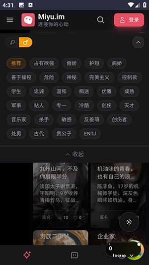 Miyu ai是一款超级好用的ai虚拟恋爱聊天软件。软件中玩家可以自定义创建角色,选择他们的性格人设,如占有欲强、傲娇、护短、病娇等,并且还能设置角色的形象,完成后就能随时开启聊天了,得益于智能的ai技术,软件能成为你心灵上的忠实伙伴,有兴趣的朋友们快来下载体验吧。