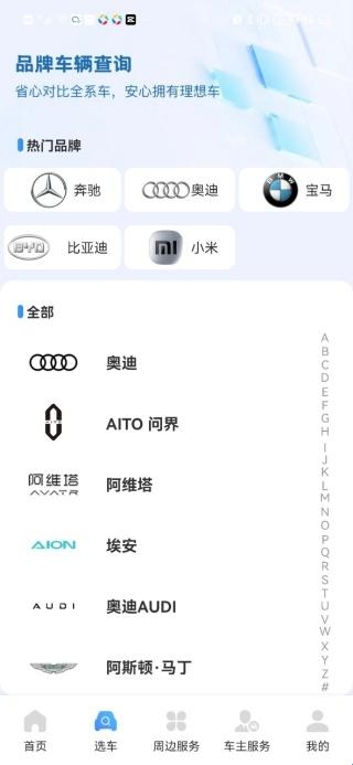 2、在选车页面中提供品牌车辆的查询,根据不同的品牌进行查询对应的车辆信息;