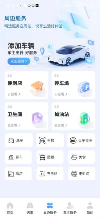 3、在周边服务页面中可以添加车辆,同时了解便利店、停车场、卫生间以及加油站的信息。