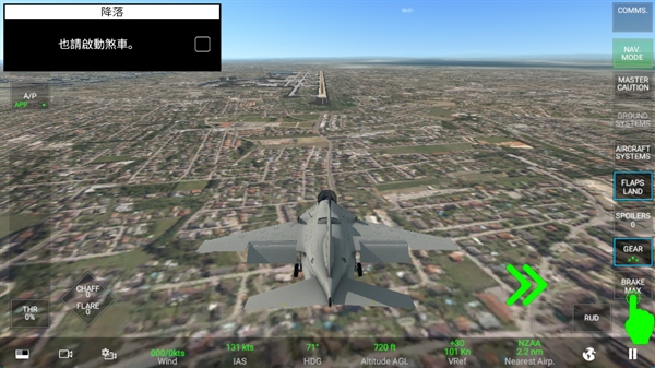 7、最后点击屏幕右下角的“BRAKEMAX”,将发动机关闭,降低飞机的飞行速度,再缓慢调整飞机角度,对准跑道。