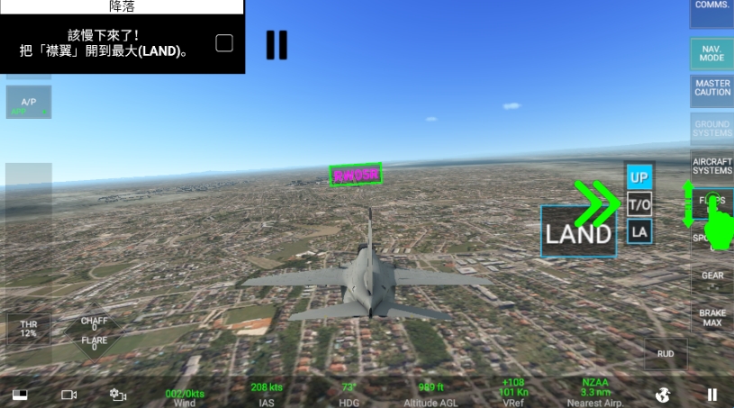 5、整个过程中需要控制好机身,不要倾斜,与地面成平行姿态,因为开启了辅助功能,所以最好不要操控飞机的方向,除了对准跑道,随后按住屏幕右侧的“FLAPSUP”,向下滑动,到LA。