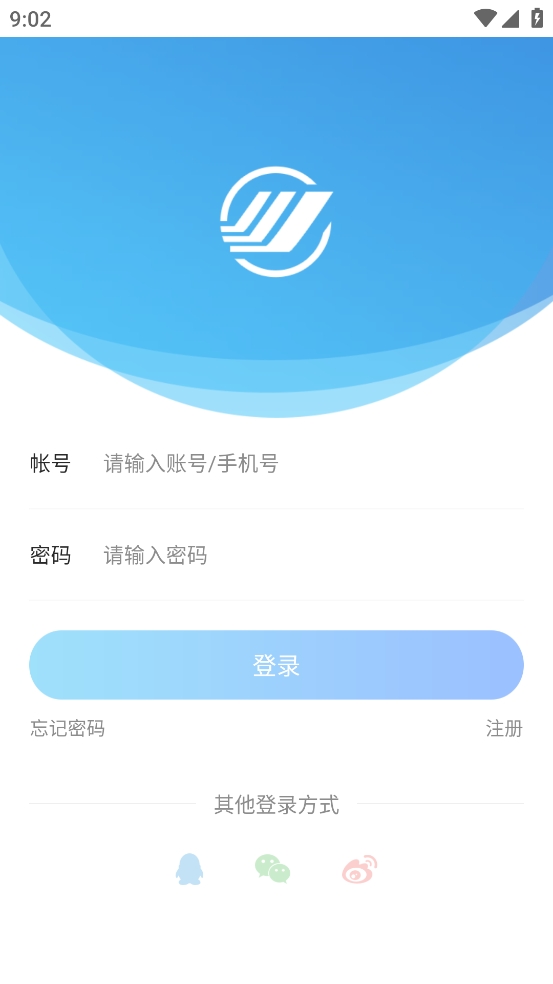 1、登录界面,需输入账号密码登录,也可通过忘记密码、注册或QQ、微信、微博等其他方式操作。