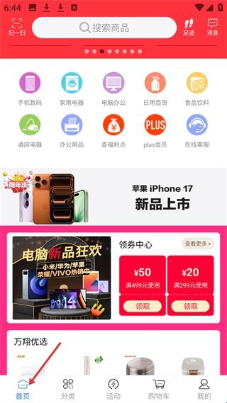 2、首页有搜索栏,可浏览手机数码等多商品分类,还有iPhone17新品上市、电脑新品狂欢、领券中心及万翔优选商品展示。
