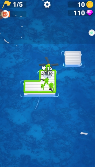 2、控制木筏开始移动,拾起海中的金币和钻石,建造你的射击塔,射击对方敌人。