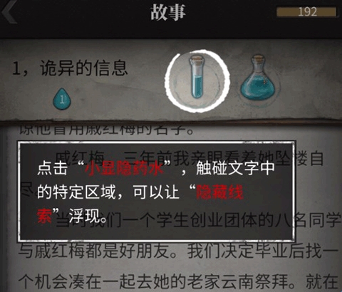 6、隐藏线索应该怎么找呢?如果你看到比较可以的线索可以用小显隐药水,如果这些字眼是线索的话,就会出现红色血珠,如果不是的话,玩家们可以继续寻找。使用小显隐药水是不消耗精力的哦。