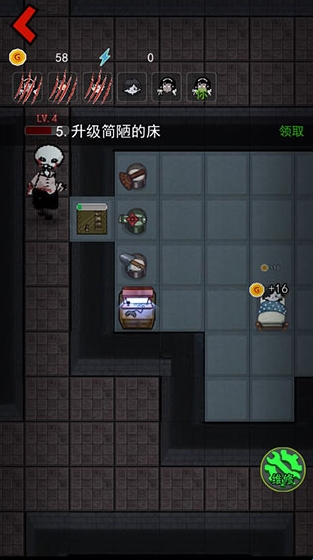 在睡觉的时候玩家们可产生金币,通过金币玩家们可升级门、床、以及装备武器;