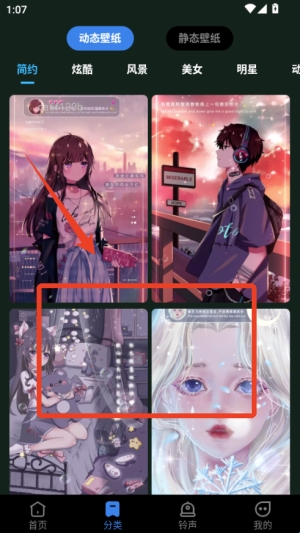 2、点击分类,分类里面有简约,炫酷、风景等多种壁纸可以选择;