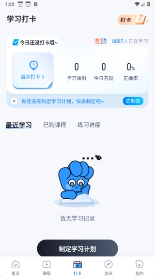 3、学习打卡模块追踪每日学习进度,同步展示已购课程与练习完成情况。