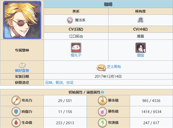 一技能增加友方一个单位的攻速,大招群体伤害但是有几率对自身造成伤害(攻击力90%)……我没用过,因为意外性太多,增加攻速的飨灵有比咖啡好的……不过他有可搭配的连携阵容