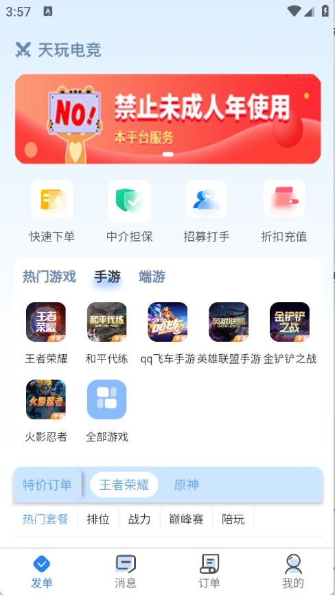 天玩电竞app是一款超级好用的游戏代练接单平台。软件的代练服务范围覆盖王者荣耀、原神、英雄联盟、金铲铲之战、火影忍者等超多热门游戏,并且支持手游、端游等多个平台。用户可以选择使用快速下单、中介担保、招募打手等功能,交易建立后可以随时查看订单状态。有需要的朋友们欢迎下载体验。