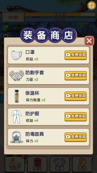 3、此外,在装备商店中玩家可以购买口罩、防割手套等各种道具,能够用来翻找更多不同类型的垃圾。