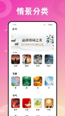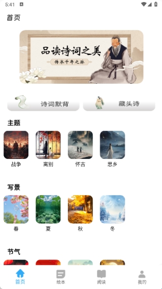 1、在首页中有诗词默背、藏头诗、主题、写真、节气等不同类别内容;