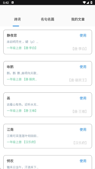 2、点击诗词默背可以了解关于诗词、名句名篇以及我的文章内容;