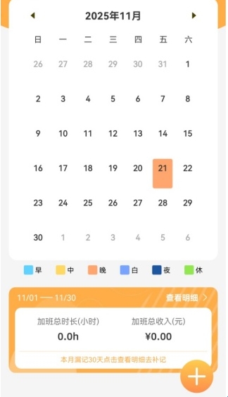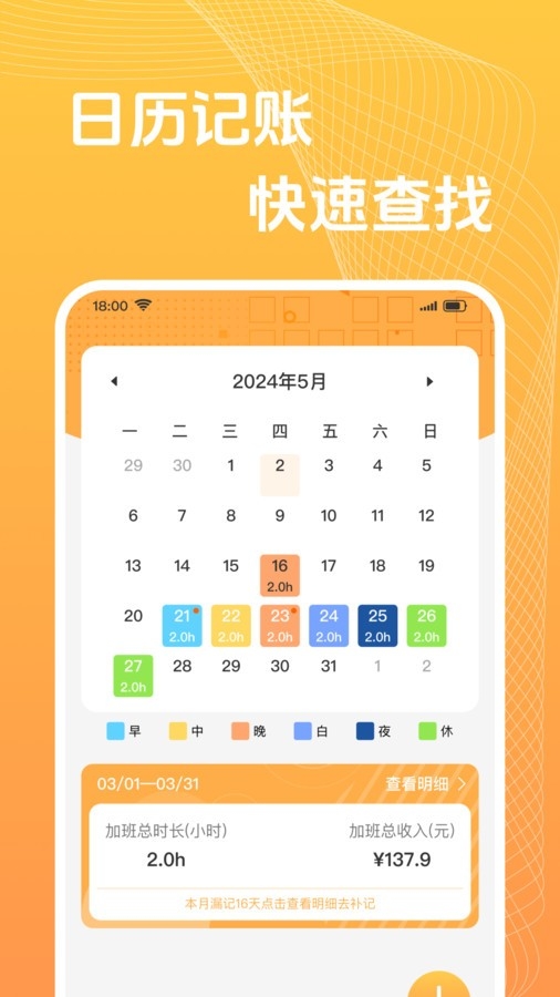 2、支持快速查找每日工时记录,不同颜色标记区分不同班次,还能查看月度加班总时长和总收入。