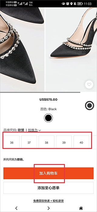 2、然后进入心仪商品的购买界面,选择尺码后点击加入购物车