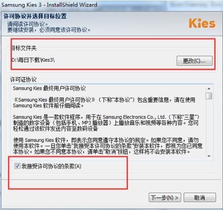 1、在网站内下载Kies Air,并解压到当前文件夹中,点击其中的Kies3Setup.exe应用程序,来到安安装界面,我们选择软件安装位置界面,建议用户们安装在D盘中,然后勾选接受协议,点击下一步。