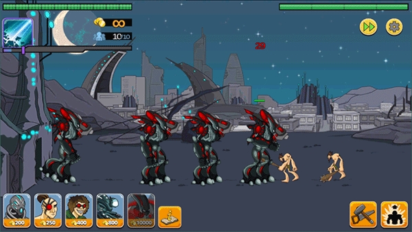 从山顶洞人骑恐龙世界大战坦克训练一支庞大的军队!一路毁灭未来的机器人战士!有这么多不同的单位来训练跨越7个完全不同的战争年代。29单元类型在您的处置,如攻击斯巴达,阿努比斯的战士,法师,骑士,步兵炮,榴弹兵、机器人和这么多更多!如果你认为最好的进攻是一个强大的防御尝试堆叠一排炮塔,切断敌人!是的,我们仍然有着名的鸡塔,这是一个必须建立。