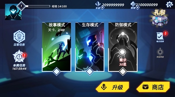 2、进入游戏游戏可看到,有着故事模式、生存模式、防御模式等三种模式可选