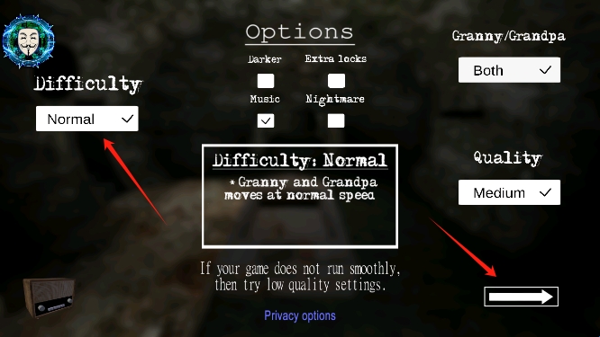 2、这里你可以自由选择难易模式和一些其它的设置,选择完毕点击右下角的箭头开始游戏