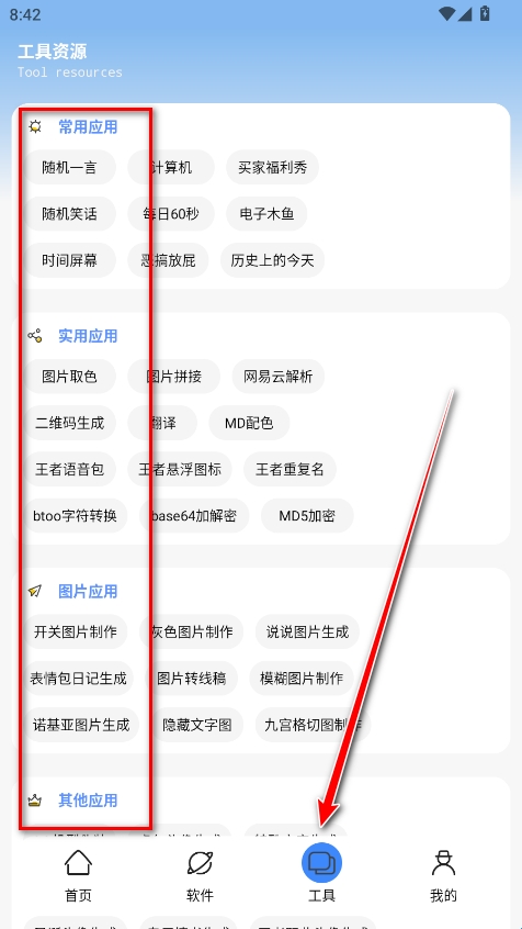 7.返回点击下方的工具板块,可以看到这里有着最新的常用工具、实用工具、图片应用、其他应用等板块内容,每一个板块下面都会有十几种小工具,都是支持免费使用的哈。