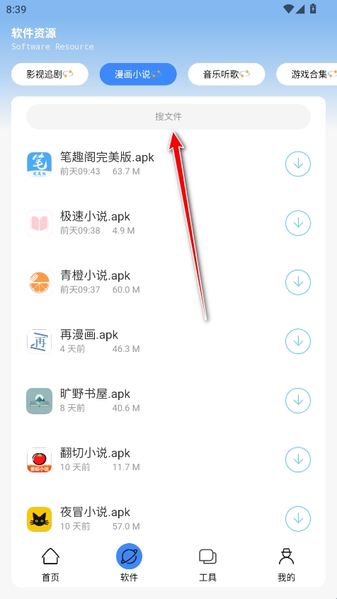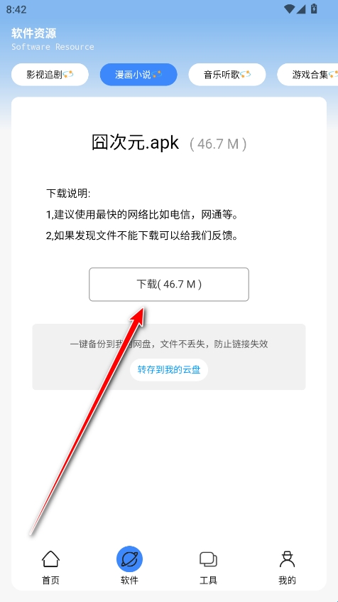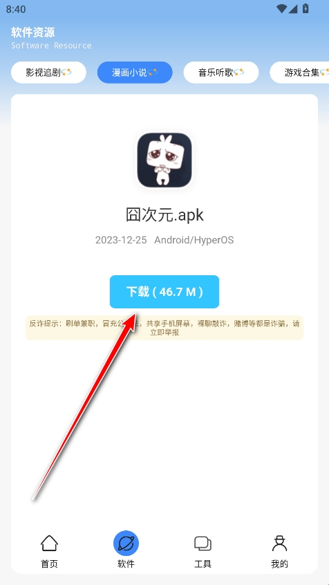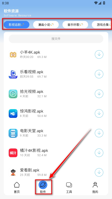 2.点击下方的软件板块,可以看到这里主要有最新的影视追剧、漫画小说、音乐听歌、游戏合集等板块内容。