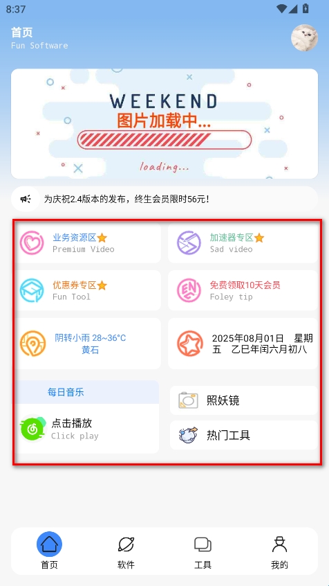 1.首先请在本站下载安装并打开最新版本的云玖简盒,可以看到首页主要有着最新的业务资源区、每日音乐、热门工具。