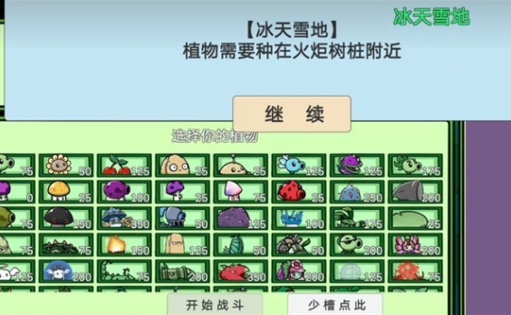 1、这个关卡的植物都需要种植在火炬树桩附近才行,建议选择火炬树桩、燃爆向日葵、榴莲投手、西瓜迫击炮、西卡投手、恶魔西瓜投手、毁灭菇、阳光菇、美须藤。