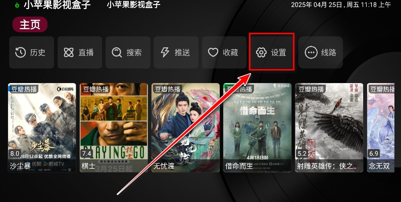 1.打开小苹果影视盒子,点击设置。