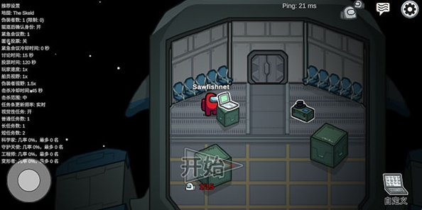 在我们之间游戏的场景发生在一艘太空船上,游戏分为两个阵营。船员阵营(好人)和冒充者(狼人)