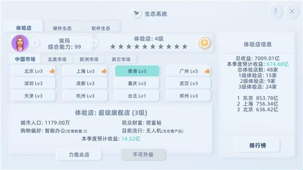 把体验店全升到3,人口低于360万的最后升。硬件研究一般价格和时间加起来差3个档次。力争25年全部满级,体验店8个3。手机被打压就给钱,做到十个敌人放在一边不管,6个友商记得刷好感。硬件不要停,手机99~100分(有时材质不行)。26年力争20个3,600亿利润,硬件全解锁。