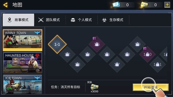2、玩家在游戏中可以选择自己喜欢的模式进行畅玩,其中提供了故事、团队、个人、生存模式这四种玩法模式可以体验;
