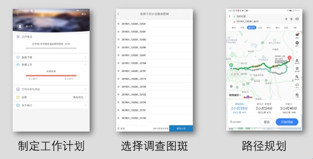第二步调查图斑选取与路线规划(1)在用户管理页面,点击“工作计划和日志”,选取待复核图斑,制定工作计划。(2)APP内置导航功能,可导航至任意项目或图斑。