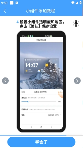 4、设置小组件透明度和地区,点击“确认”保存设置