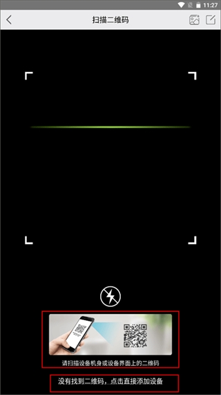 2、将扫描框对着设备机身或设备界面上的二维码,如果没有找到二维码,就可以点击下方的“直接添加设备”文字按钮。