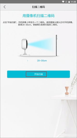 5、输入家中WiFi的密码并进入下一步,点击下方的“开始扫描”,这时手机屏幕上就会显示一个二维码,将摄像头对准手机屏幕一定距离,扫描成功后就可以添加成功了。
