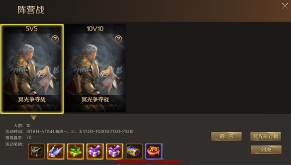 5v5模式下,每个阵营均可容纳5人,争夺战开启时间为每周一、三、五12:00-14:00及21:00-23:00时段;