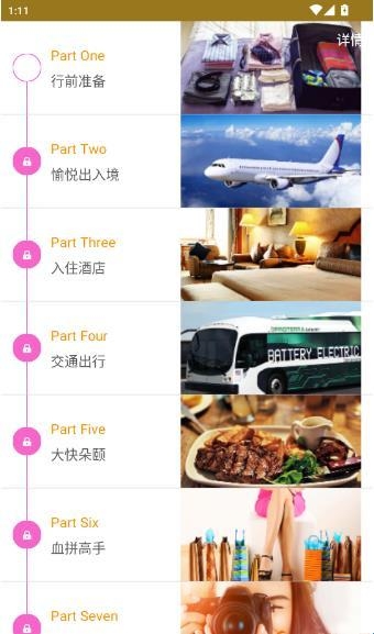 将不同旅游场景所需的英语分类,分为了行前准备、愉悦出入境、入住酒店等多种类型。