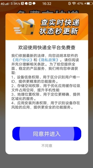 1、下载并安装后打开软件,点击同意并进入即可开启快递查询服务。