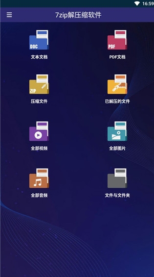 1、下载好7zip解压缩软件app后,点击进入,在主页中选择你要压缩的文件种类。